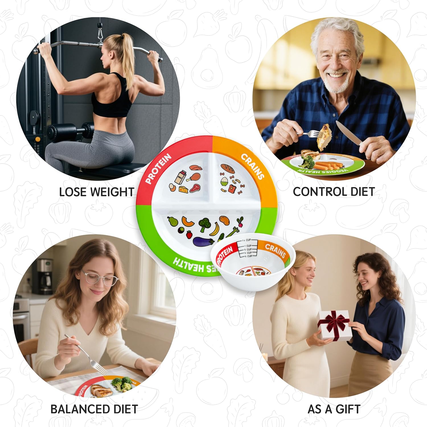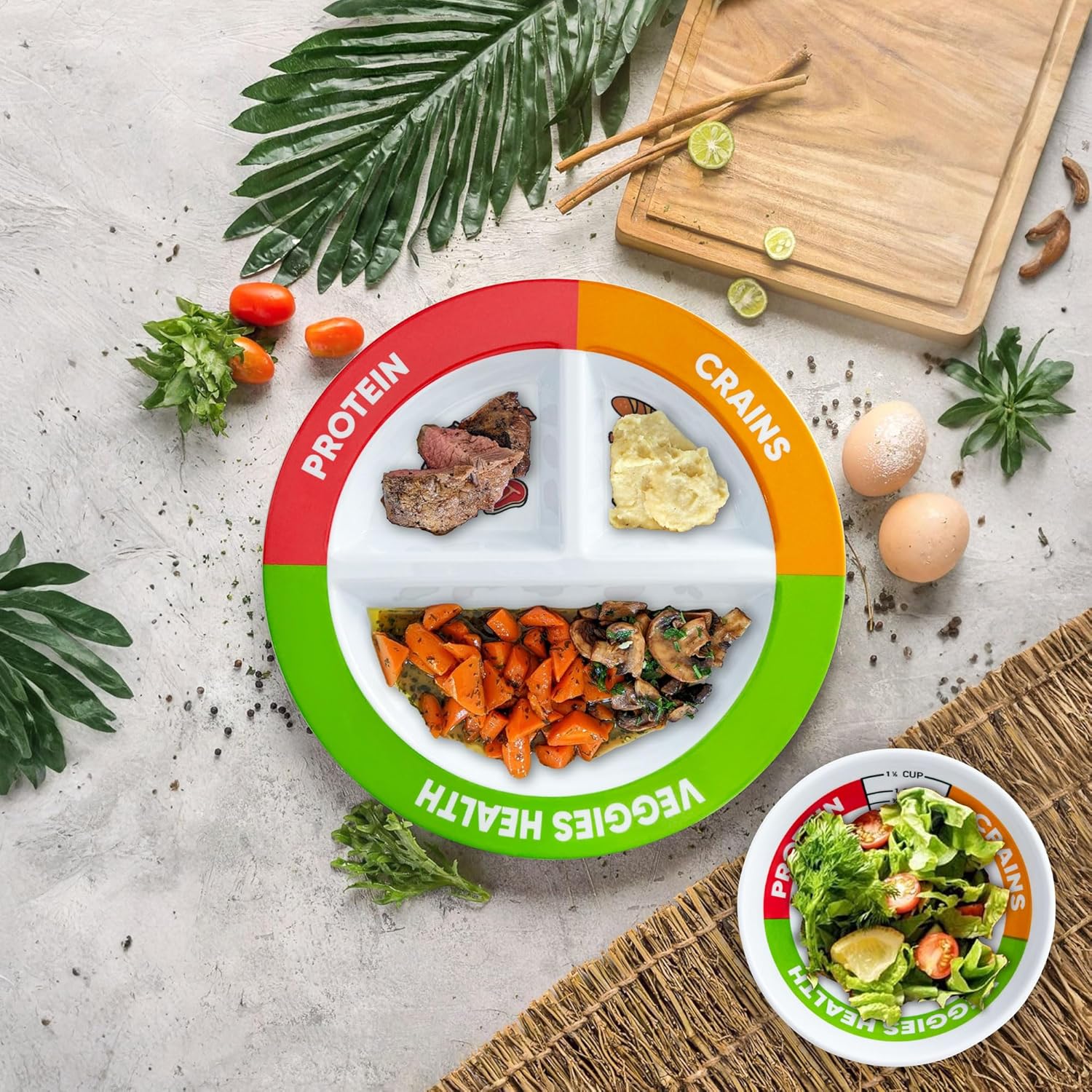 I just picked up this portion control set, and it is a pretty smart concept! The plates are made from some seriously sturdy plastic—like, I could probably drop one and it would just laugh at me. But let me share a couple of my regrets. First off, the word “grains” is misspelled as “crains.” I mean, come on! It’s not just in the description; it’s in the pictures too! So, if that kind of thing bugs you, well, you’ve been warned.Secondly, I discovered that these aren’t microwave-safe, which is a bit of a bummer since I practically live in my microwave. But hey, I guess it’s time to learn a few new cooking techniques—like maybe using that thing called the stove? Who knew!Now, let’s talk size. The plates and bowls are just right for keeping portion sizes in check. I find myself feeling full after meals, which is a win in my book, considering I’m trying to slim down. With these beauties, I’m feeling like “skinny me” is starting to become a reality!As for the price, I can’t help but be a little skeptical. For $22, I feel like I should be getting something more, given the plastic material and the little typos. Honestly, I think this set should be priced closer to $15. So, while it’s definitely helping me with portion control, I’m left slightly dissatisfied when it comes to value. Overall, if you can overlook a few flaws, this set does its job and has potential for achieving healthier eating habits!