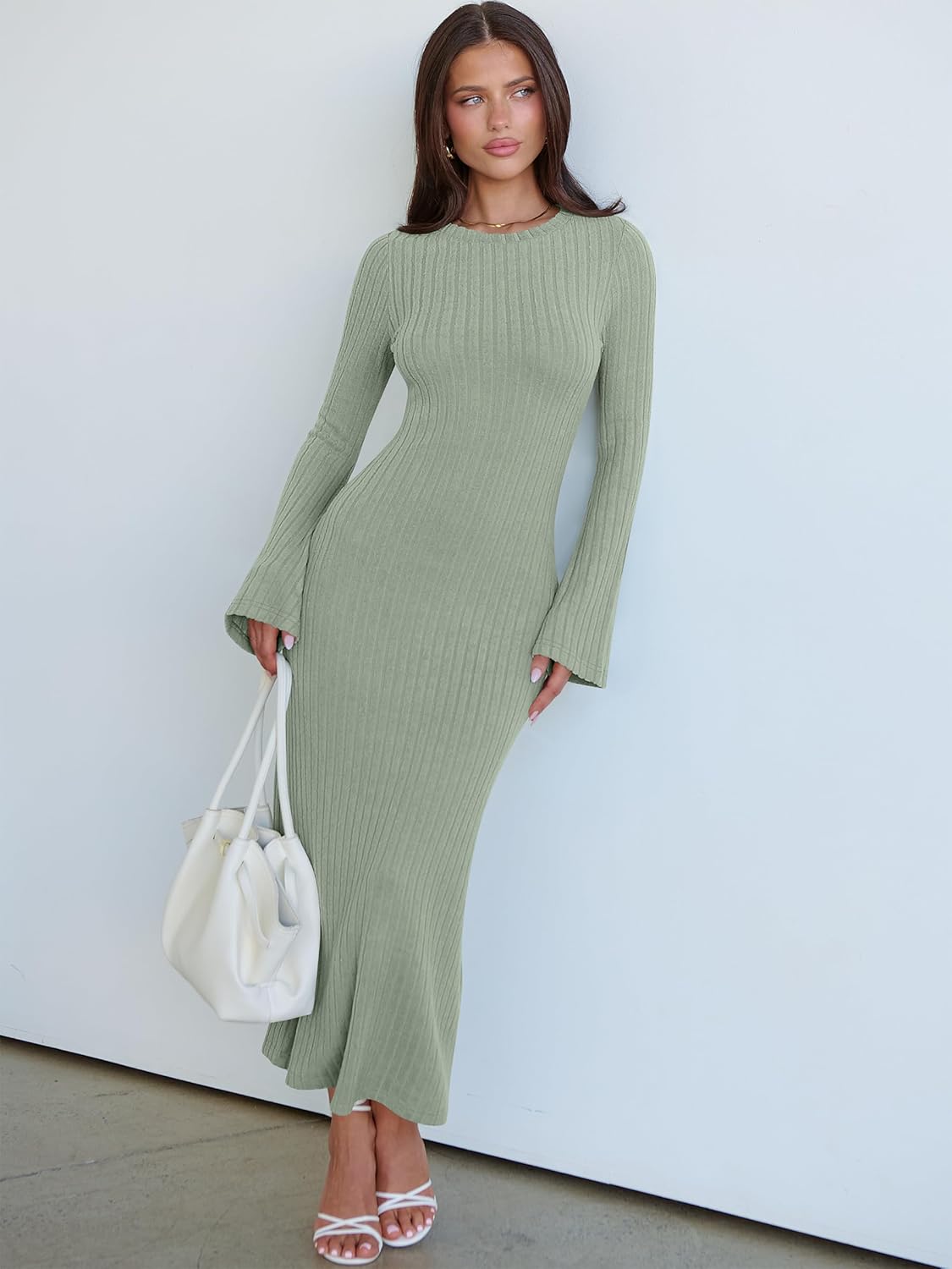 ANRABESS Womens Bodycon Maxi Dresses 2025 Fall Casual Flare Sleeve Crewneck Lounge Comfy Sexy Ribbed Knit Long Sweater Dress