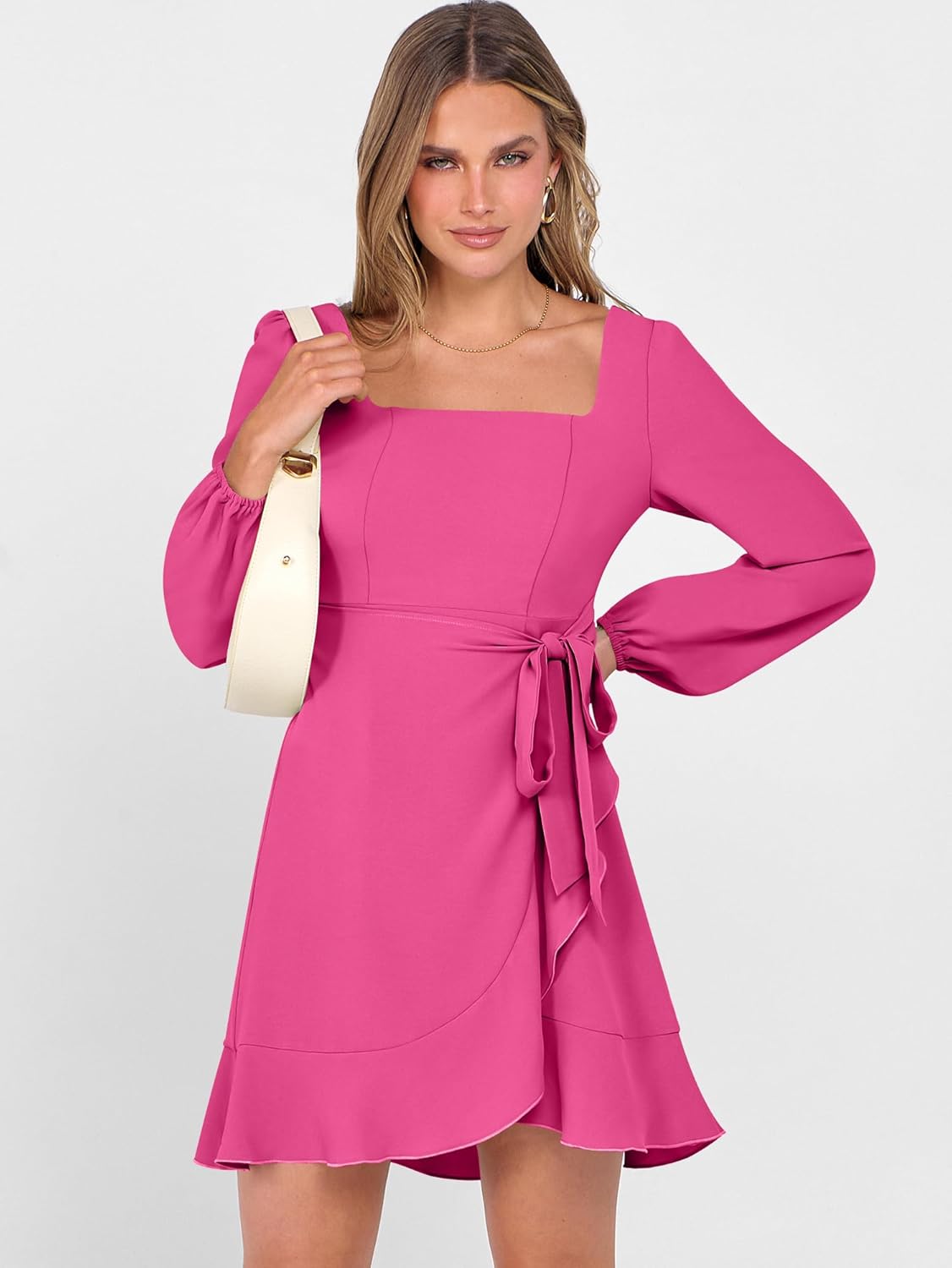 8 reviews for ANRABESS Womens Dress Long Sleeve Square Neck Tie Waist Ruffle Hem Short Cocktail Wedding Guest Fall Party Club Mini Dresses
