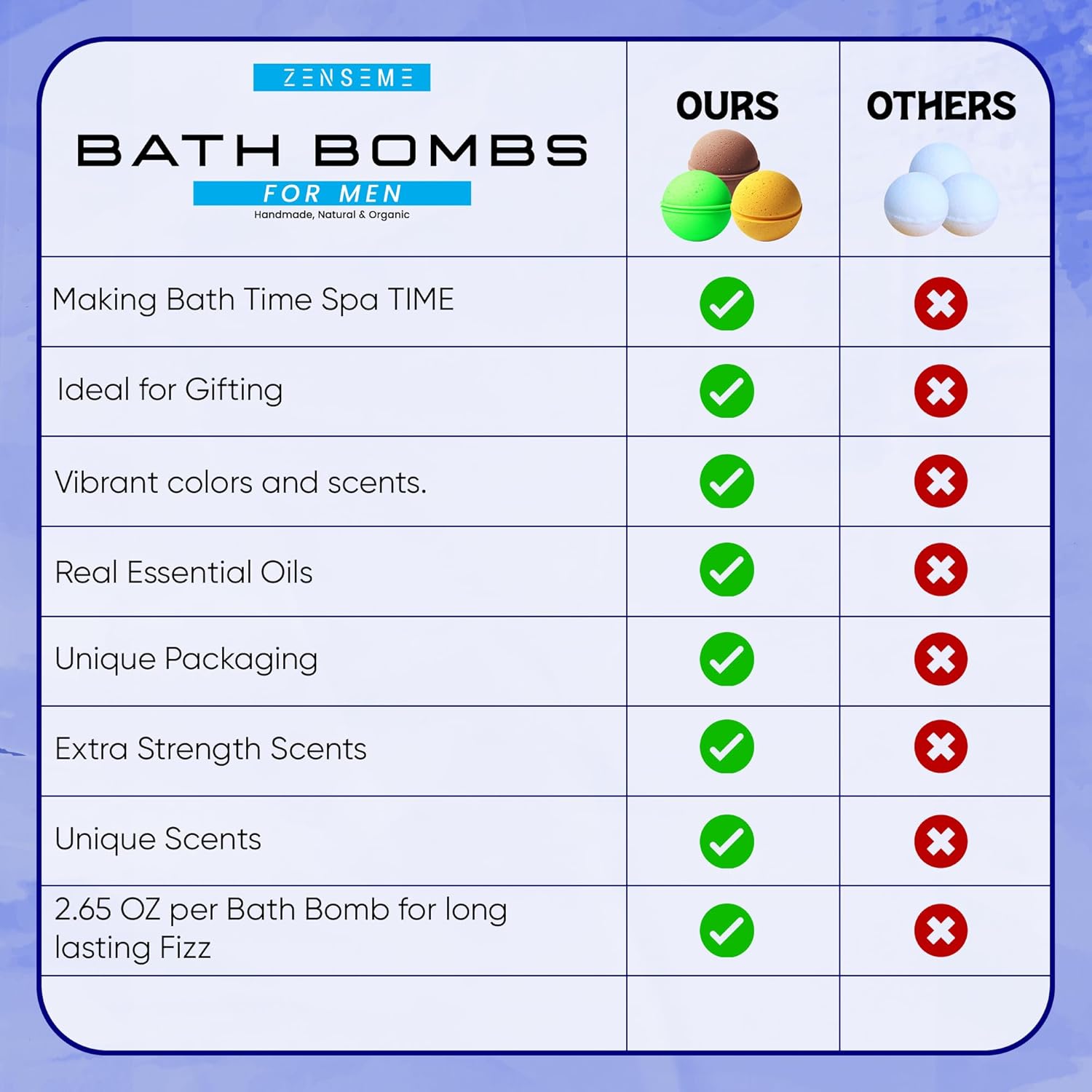 AROMATHERAPY – each men’s bath bomb uses aromatic essential oils to improve the health of the body, mind and spirit. Vitalizes the body, balances the mind, soothes the skin, relaxes and soothes sore muscles and leaves the skin soft and full of moisture.