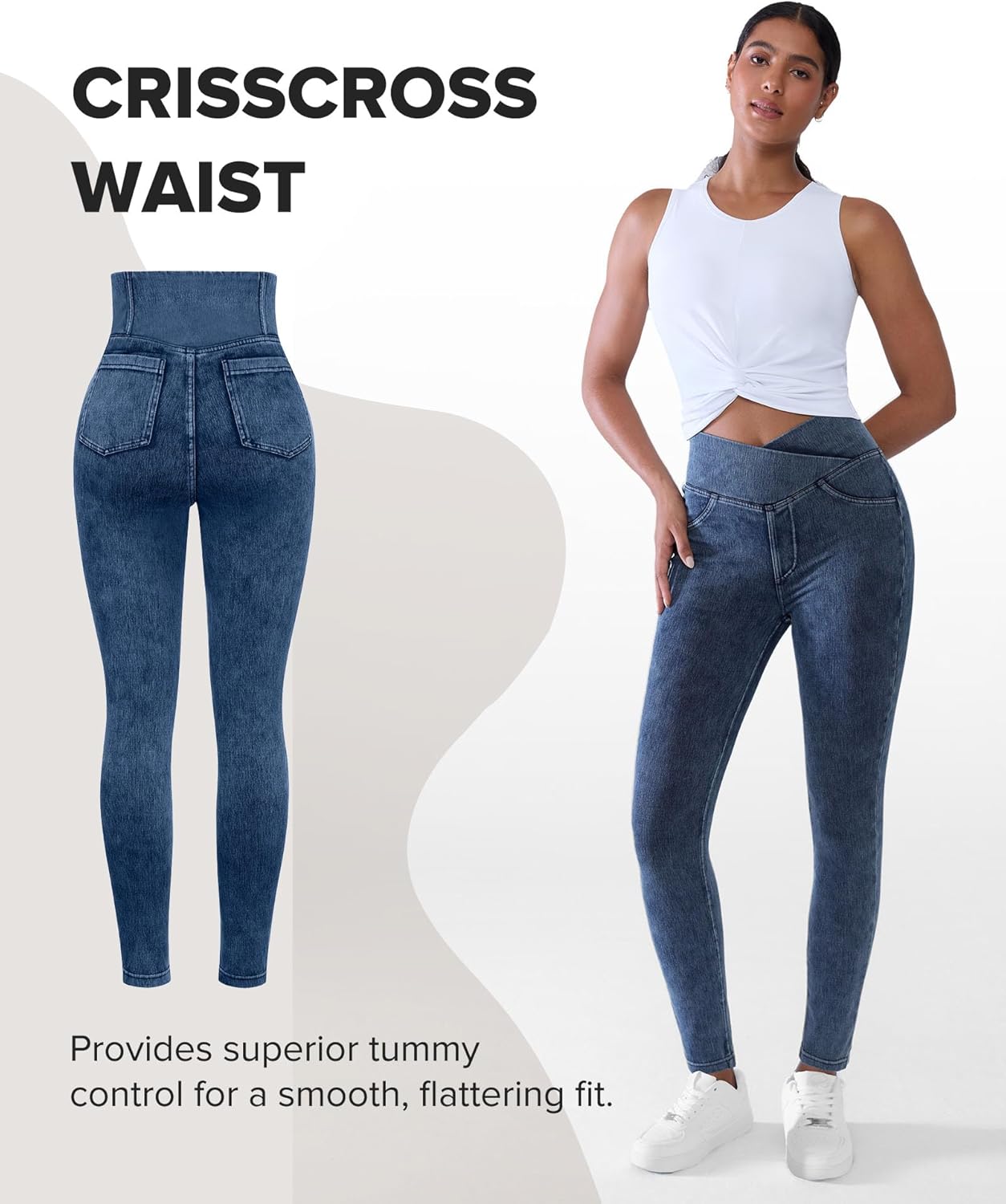 When I ordered these, I saw blue leggings as the descriptor and noticed that they looked like denim. Denim is a new big trend in exercise gear where I live so I thought I would give a shot. Wearing these now, I see that these are thick like jeggings (and probably not as breathable as thinner options) but definitely flexible enough that would could conceivably exercise in them at lower intensities. Color wise I like the denim and feel it is a nice dark wash that was color fast after being washed. Overall I think that these are best worn as jeggings because they are nice and thick and feel more like jeggings than traditional fitness wear and casually is how I will continue to wear these.I am athletic enough to have muscle along my booty and legs and have an overall pear shape with a narrow waist and the size chart for my hips suggested that I would order between a size XL and XXL. I ordered the XL and found that these run a little big on me. They are a little loose in the crotch area and throughout the leg. This is probably because the waist is too loose when I pull it up more to where my waist is narrower. I found that these stretch A LOT! My inseam is around 33″ and the legs stop high on my ankle. The waistband design is interesting and asymmetrical. I do not know if I love the design and I personally opt to wear tops that cover it. If the V were a bit more centered and if it were a bit more fitted for my body and my waist specifically, I might want to show off that area a bit more. I think this is a good pair of jeggings if waist control is an issue and there is plenty of negative ease in the waistband measurement for your size.