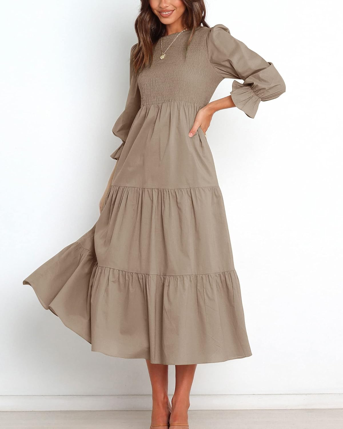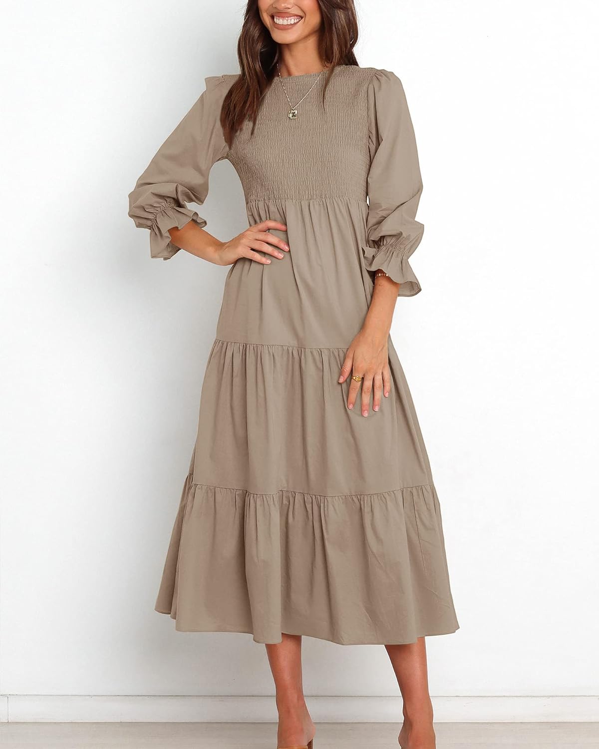 I absolutely love this brown long sleeve dress! The color is rich and versatile—perfect for fall but neutral enough to wear year-round. The fit is incredibly flattering without being too tight, and the fabric has just the right amount of stretch to make it comfortable for all-day wear.The long sleeves give it a polished look, and the dress easily transitions from casual daytime errands with sneakers to a dressed-up dinner with boots or heels. I’ve already received multiple compliments!It also washes well—no fading, no shrinking. This has quickly become one of my go-to pieces, and I’m considering ordering it in another color if available. Highly recommend if you’re looking for something simple and stylish.