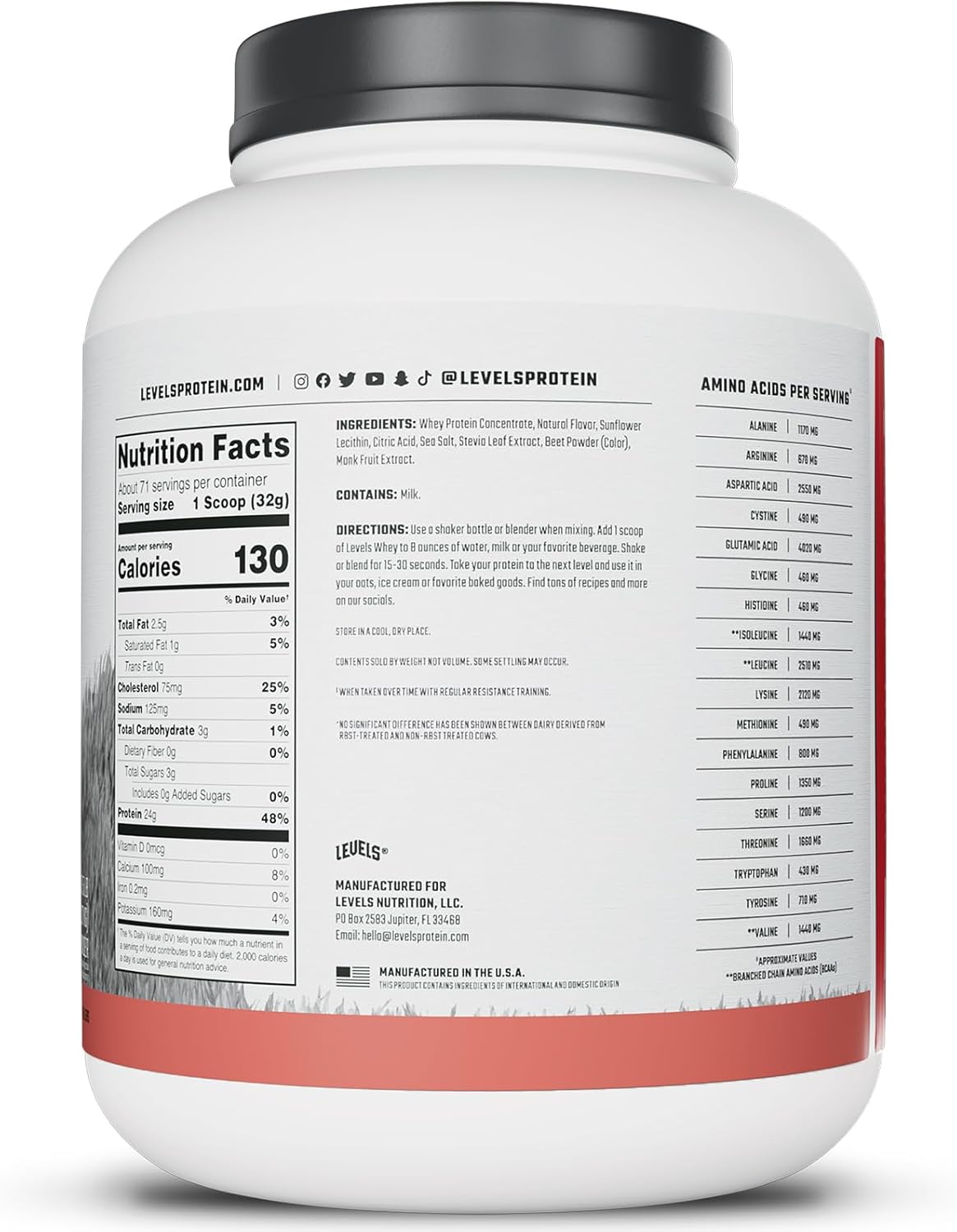 MADE IN THE USA: Levels Whey Protein is made in the U.S.A. and is undenatured to protect bioactivity and naturally occurring growth factors. Each batch is cold-process microfiltered and blended with non-gmo sunflower lecithin for that insanely easy mixing you expect.