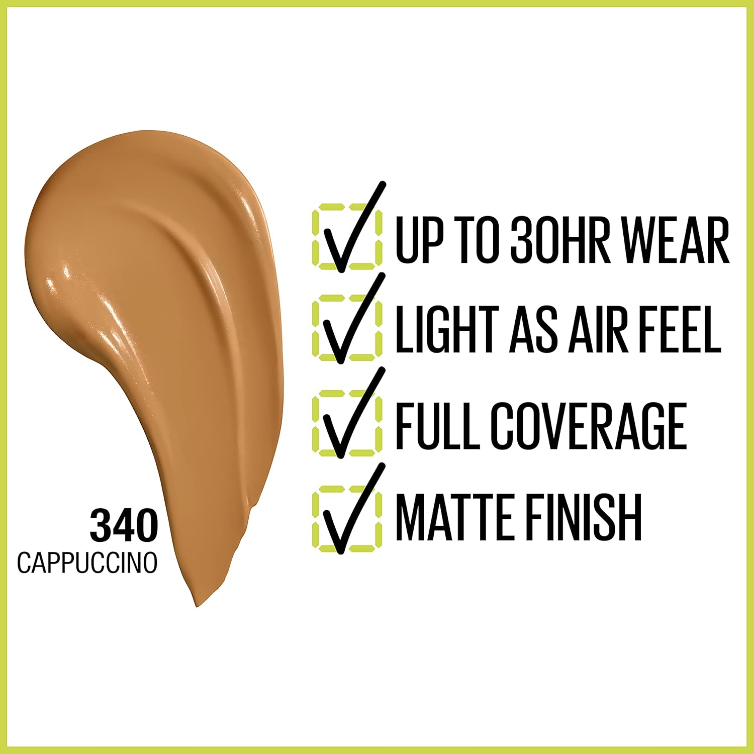 Full Coverage Matte Foundation Formula: Super Stay Active Wear Foundation is transfer resistant, water resistant and sweat resistant; Get a seamless matte foundation look that glides onto skin for even color and ligtweight wear