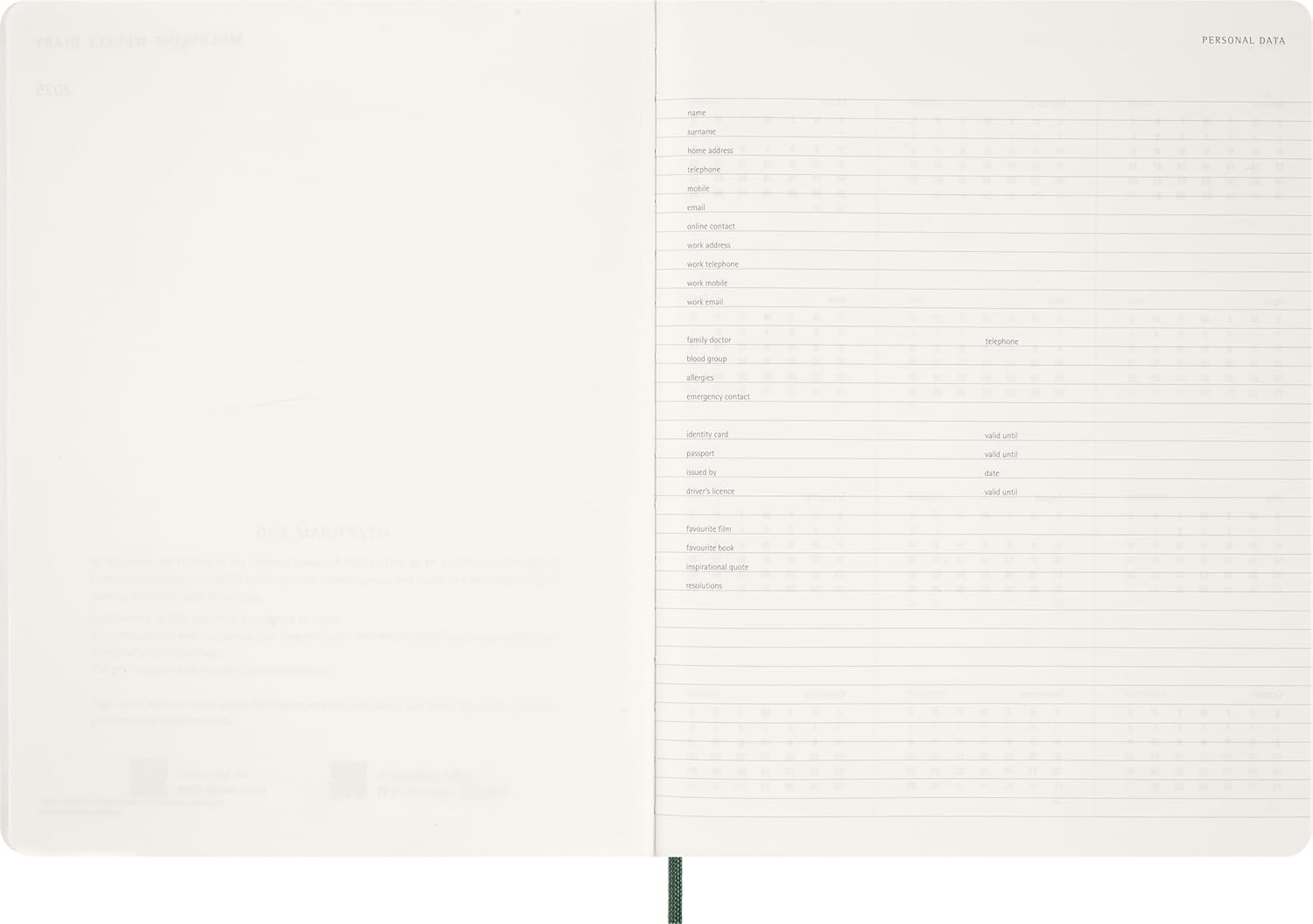To personalize your planning, it comes with plenty of stickers and a practical set of sticky notes slotted into the back pocket. A ribbon bookmark discreetly marks your place, while the elastic closure keeps contents secure and ensures privacy. Like all Moleskine planners, it opens with a personal data page and annual overviews to help track the bigger picture, with plain pages at the end for extra notes and ideas.