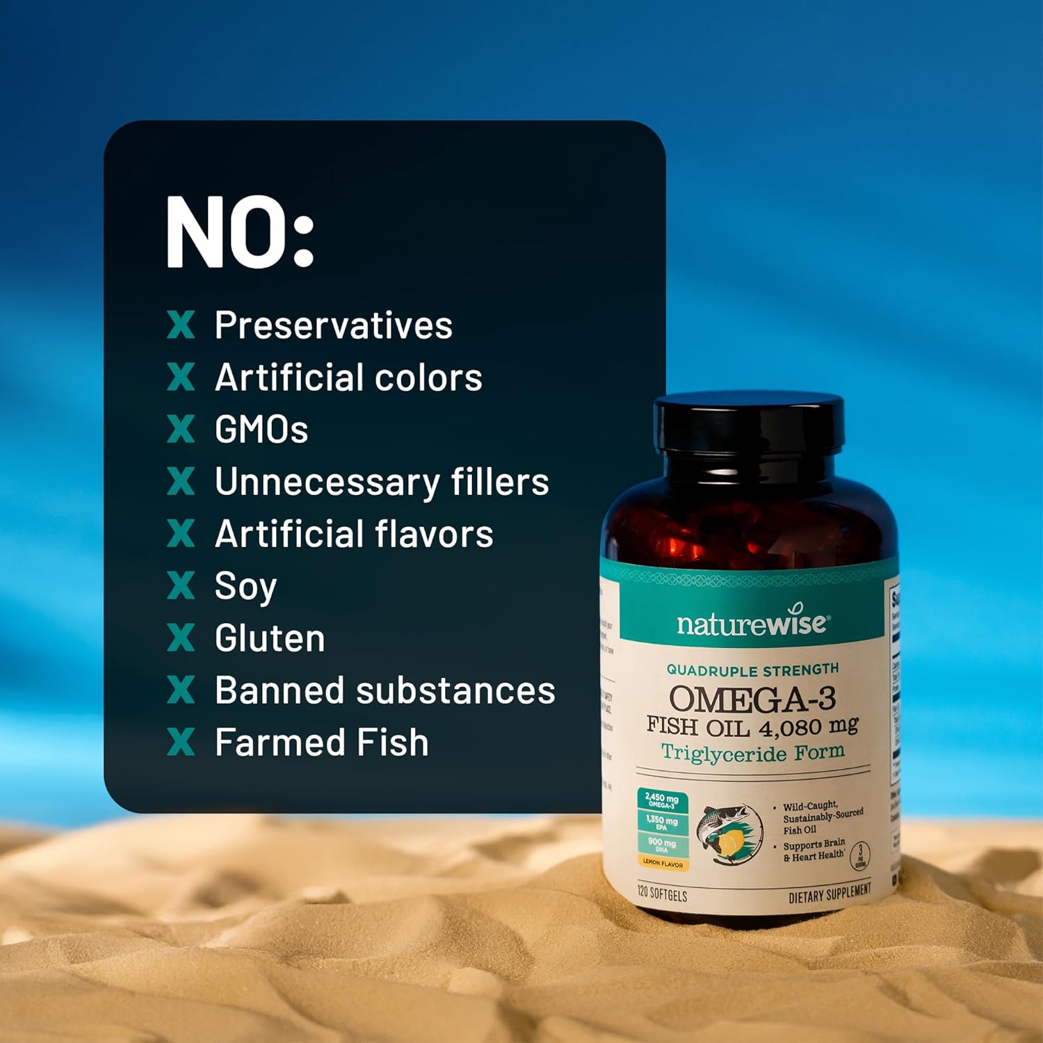 NatureWise Quadruple Strength Omega-3 Fish Oil delivers 4080 mg of premium fish oil, including 2450 mg of Omega-3 fatty acids with 1350 mg EPA and 900 mg DHA per 3-softgel serving. In its natural triglyceride form, this supplement offers superior absorption compared to synthetic ethyl ester fish oils, supporting heart, brain, and eye health.* The fish oil ingredient in this Omega-3 supplement is Friend of the Sea and MarinTrust certified, sourced from wild-caught, sustainably harvested ocean anchovies. It is purified to help remove mercury, heavy metals, and environmental pollutants, providing a clean and high-quality formula you can trust.* Formulated for comfort, these burpless, lemon-flavored softgels eliminate the fishy aftertaste often associated with fish oil supplements. They contain no artificial colors or flavors, are non-GMO, and are 3rd-party tested for purity and potency. Manufactured in the USA in a cGMP-certified facility, NatureWise upholds the highest standards of safety, quality, and transparency.* *These statements have not been evaluated by the Food and Drug Administration. This product is not intended to diagnose, treat, cure, or prevent any disease.