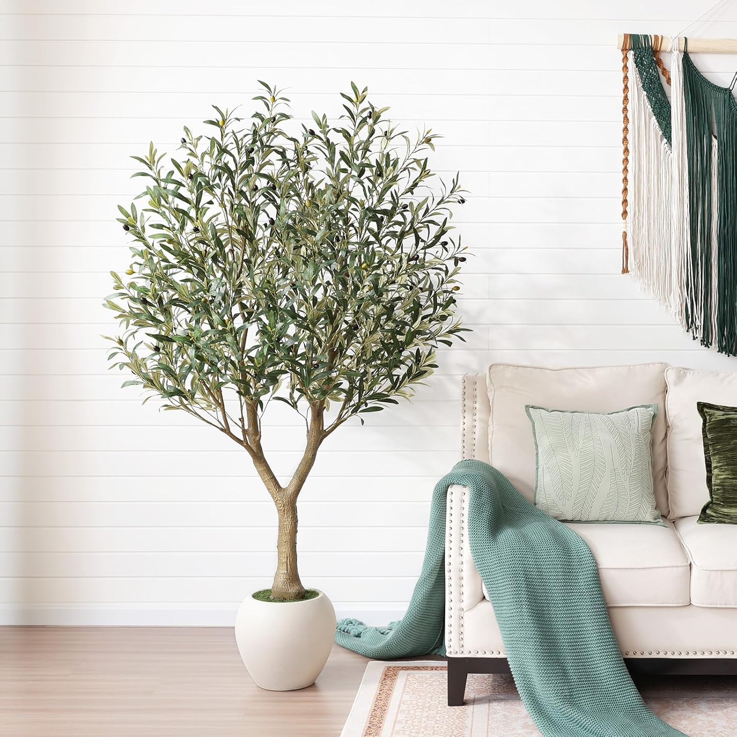 Realistic Silk Leaves & Steady Pot Design The olive tree showcases silk leaves that look and feel authentic, without plastic’s aging issues. Paired with a heavy-filled planter, it stands firm and won’t tip over, offering added safety and peace of mind for households with child and pets.