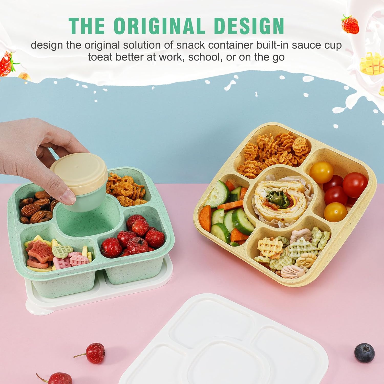 Original Lunchable Snack Containers – 5 Compartments Bento Snack Boxes with 1 Leakproof Small Containers, Wheat Straw, BPA-Free, Set of 2 (Green+Yellow)