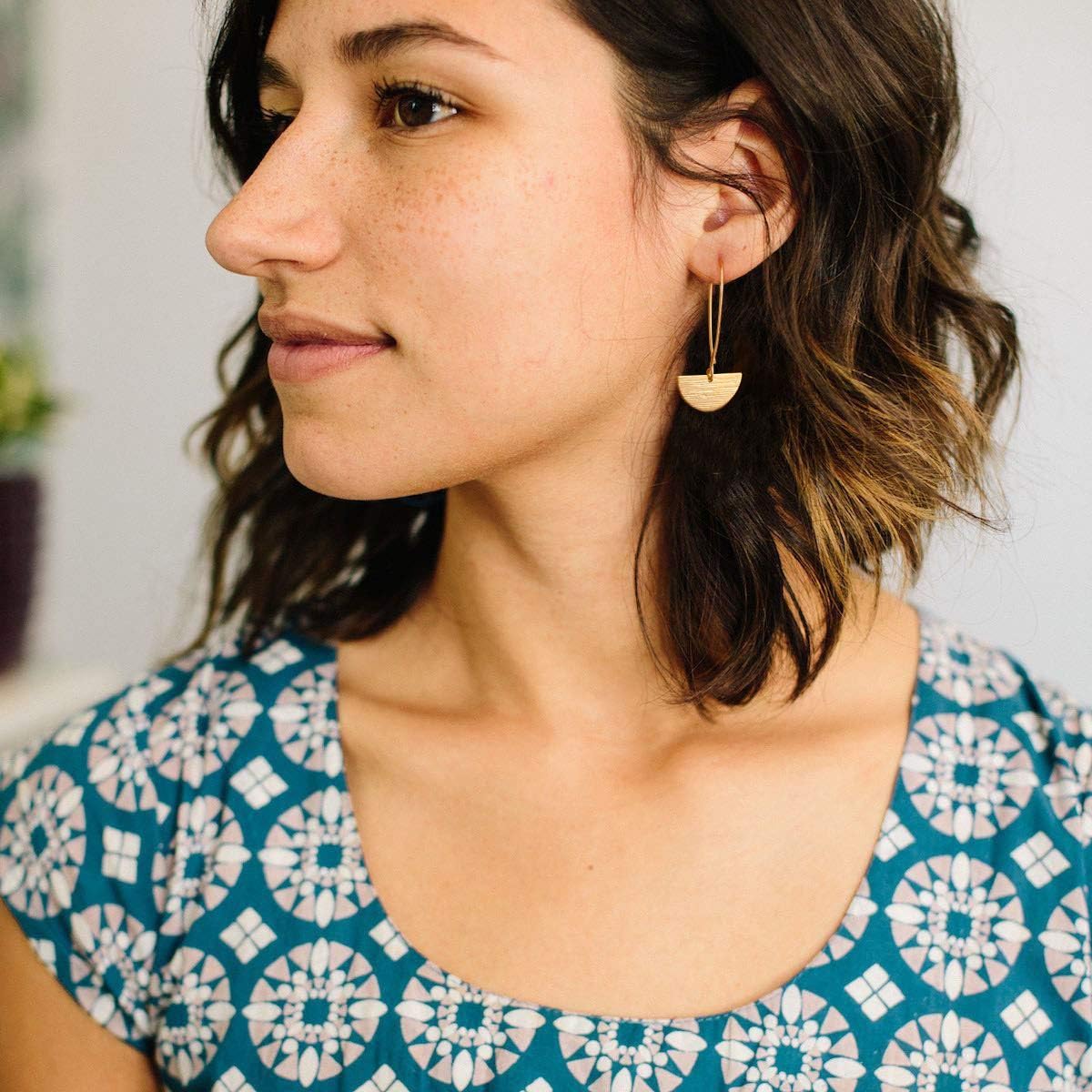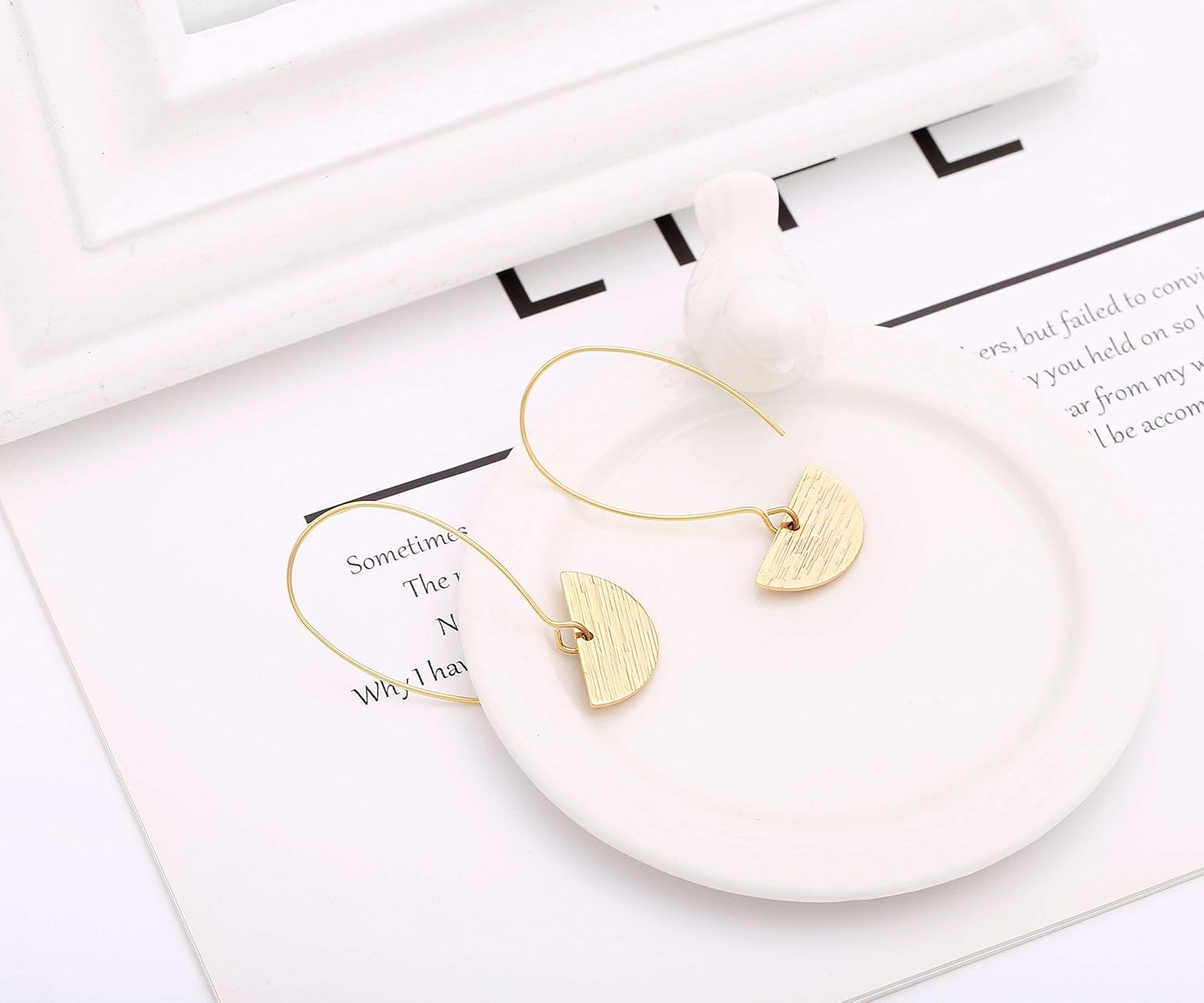 love these earrings, they look like real gold, stylish and easy to put on. they have the perfect hang not too long not too short/ they are a decent size.