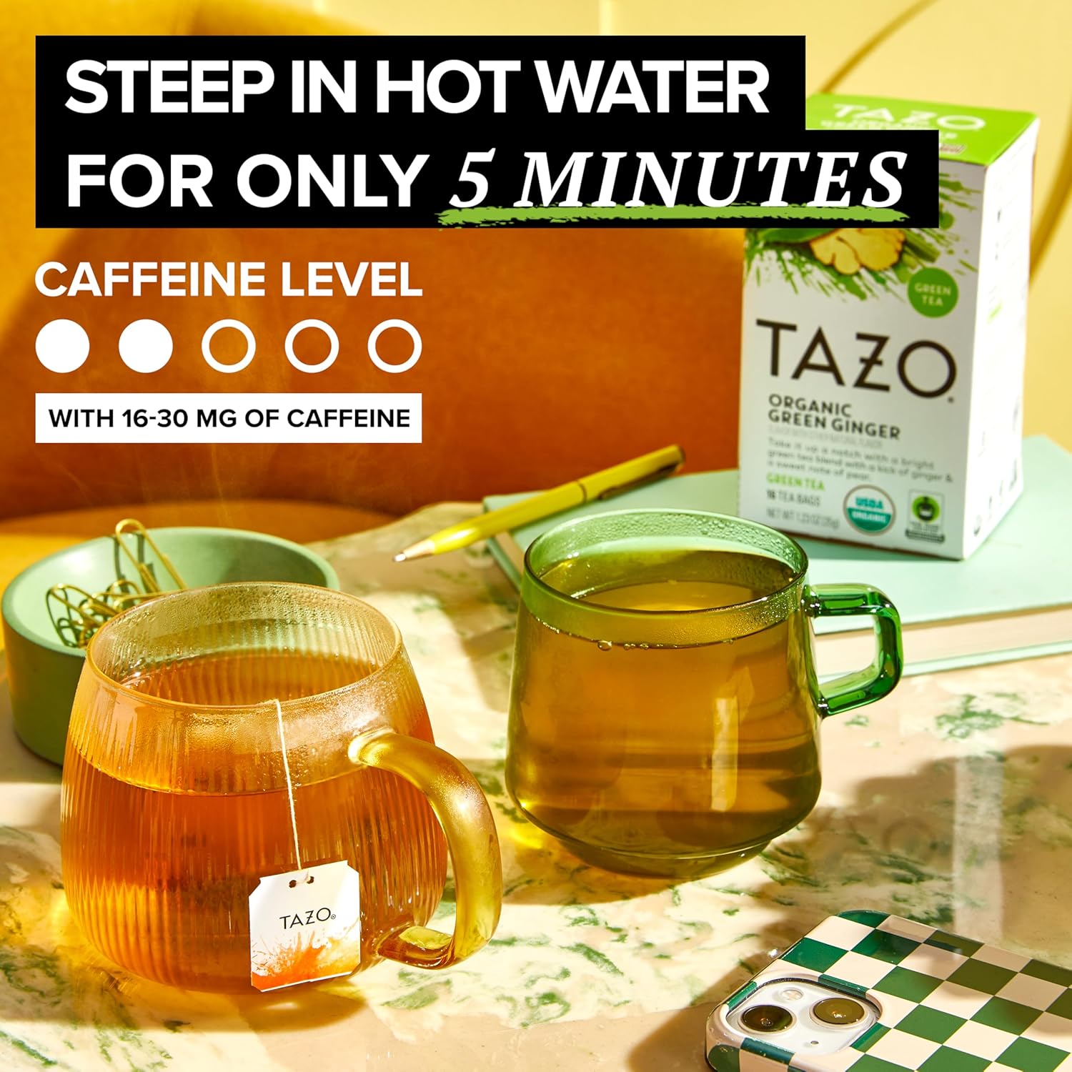 WHAT YOU’LL GET: TAZO Green Ginger Tea, non-GMO and kosher certified, 16 tea bags per pack
