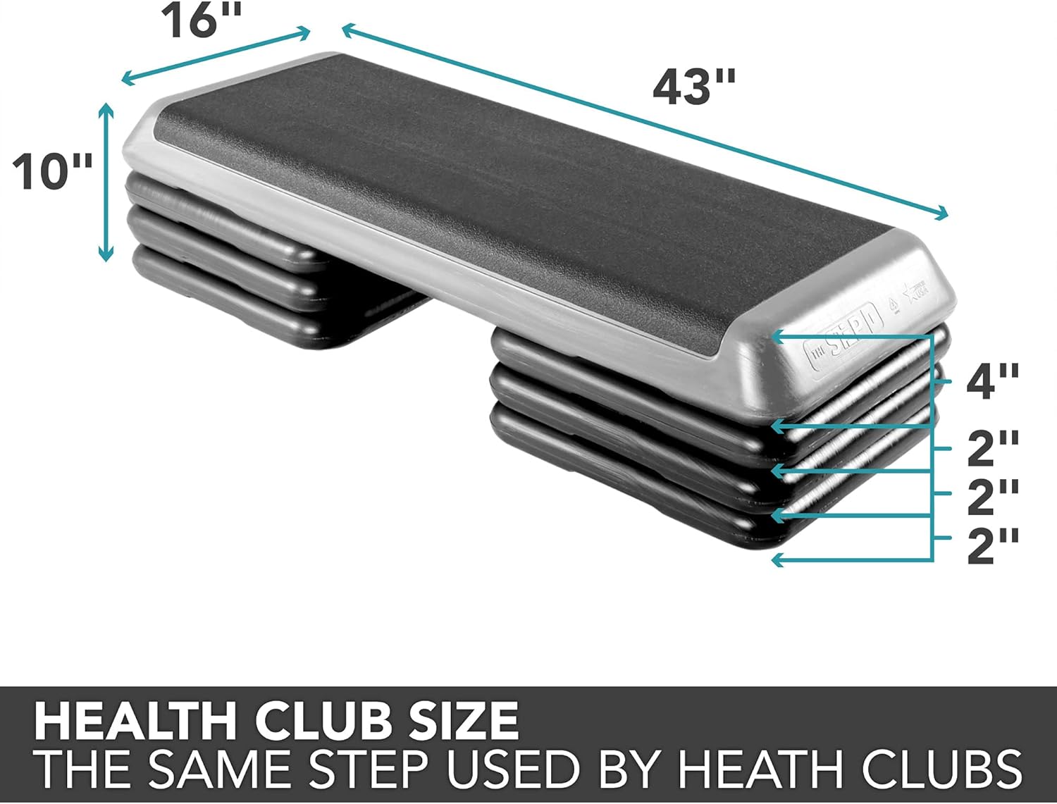 Health Club Size Platform: This aerobic step platform features a wide 43″ L x 16″ W x 4″ H stepping surface complete with a nonslip top for added safety and a comfort cushion (non-latex) top that is easy on the hands, feet, and back